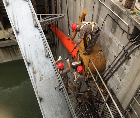正值汛期,但是水電站的維修不能等。圖為我公司維修人員頂著酷暑,在高溫下對(duì)大型水電站表孔弧形閘門液壓啟閉機(jī)進(jìn)行大修的現(xiàn)場(chǎng)